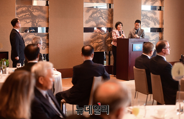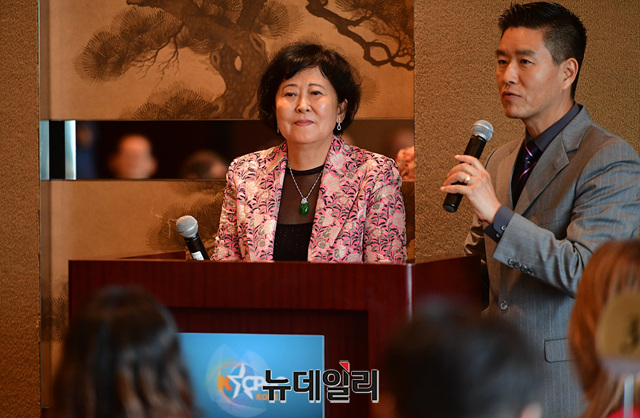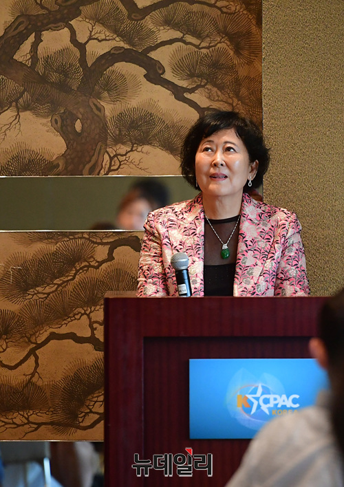 김명혜(애니 첸) 공동의장이 2일 오후 서울 용산구 그랜드하얏트 호텔에서 KCPAC2019(한·미보수연합대회) 앞두고 열린 오찬행사에서 인사말을 하고 있다.