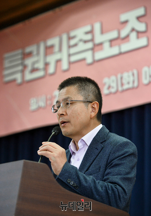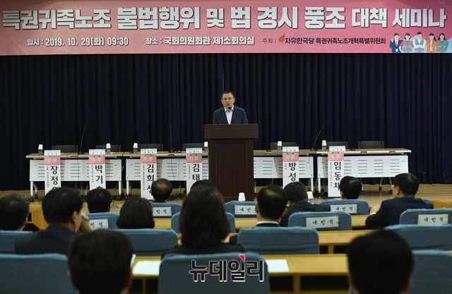 황교안 자유한국당 대표가 29일 오전 국회 의원회관에서 열린 '특권귀족노조 불법행위 및 법 경시 풍조 대책 세미나'에서 축사를 하고 있다.