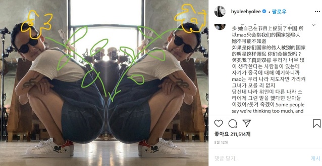 이들은 "'마오'가 마오쩌둥의 성과 동일해 중국에선 '마오이즘(마오쩌둥의 혁명사상)'을 가리키는 말로도 쓰인다"며 "한국의 일개 연예인이 중국의 지도자를 조롱했다"는 댓글로 혐한 분위기를 조성하고 있다.