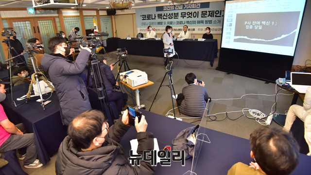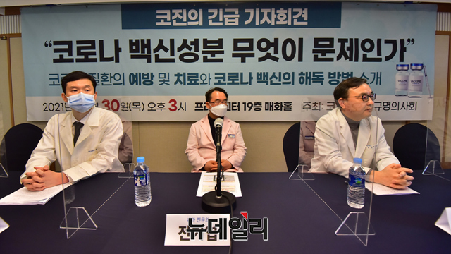 코로나 진실규명 의사회(코진의)가 30일 오후 서울 중구 한국프렌스센터에서 '코로나 백신 성분 무엇이 문제인가' 기자회견을 갖고 있다.