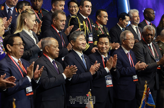 조태용 국가안보실장, 신원식 국방부 장관 등 참석자들이 18일 오전 서울 강남구 그랜드인터컨티넨탈 파르나스호텔에서 열린 '2023 서울안보대화(SEOUL DEFENSE DIALOGUE)에서 기념촬영을 하고 있다.