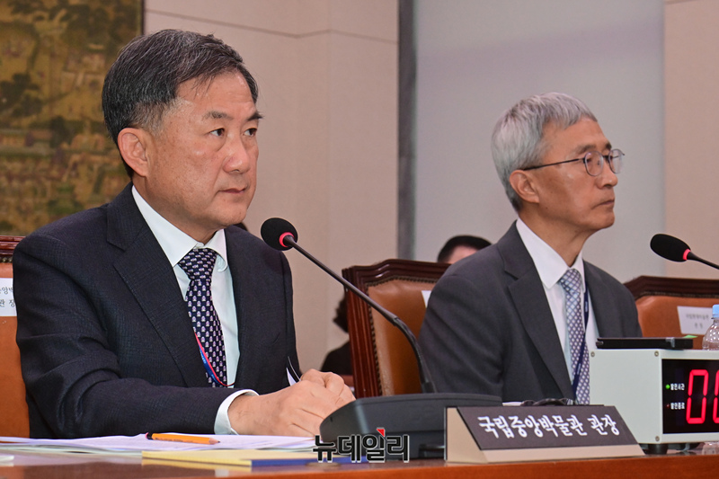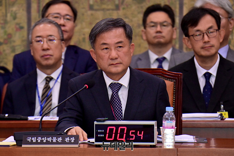 김재홍 국립중앙박물관장이 18일 국회에서 열린 문화체육관광위원회의 국립중앙박물관 등 국정감사에 증인으로 출석해 답변을 하고 있다.