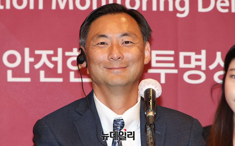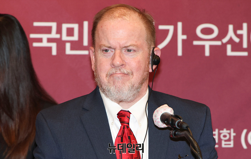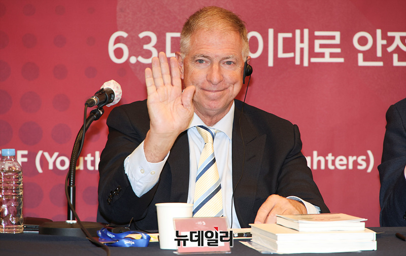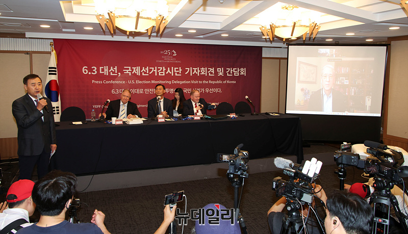 모스 탄 전 미국 국무부 국제형사사법 대사, 존 밀스 전 미 육군 대령, 그랜트 뉴스햄 전 미 해병대 대령이 27일 오전 서울 중구 한국프레스센터에서 열린 6.3 대선 국제선거감시간 기자회견 및 간담회에 참석해 자리하고 있다.
