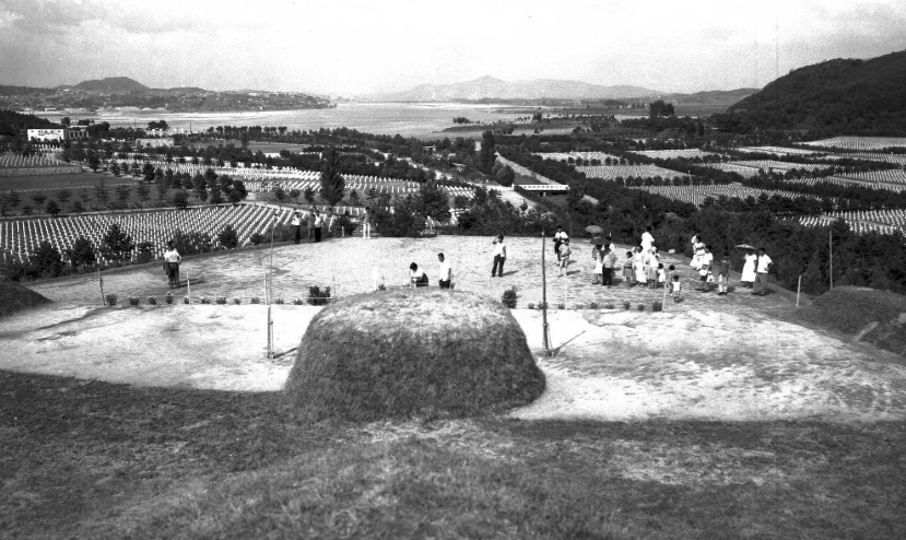 ▲ 이승만 대통령의 유해가 묻힌 60년전의 동작동 국군묘지 일대. 사진은 장례직후 1965년 7월29일 찍은 묘지봉분과 참배하는 사람들. 묘소에서 국군들의 묘역들이 한눈에 바라보인다.ⓒ서울기록원