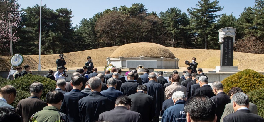 ▲ 4.19 데모의 주동자 등 4.19세대 50여명이 2023년 3월26일 이승만 전대통령의 생일을 맞아 동작동 현충원 이승만 묘소를 참배하고 "화해와 통합'의 기념식을 거행하였다. ⓒ뉴데일리DB